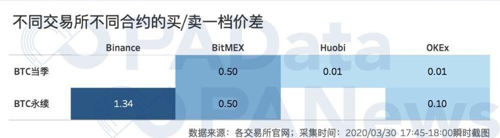 PAData分析了四大主力合约市场上持仓量较大的BTC永续合约和BTC当季合约盘口价差,从买一价和卖一价的价差来看,除了Binance的BTC永续合约为1.34USDT,大于其交易系统深度整合最小单位0.01USDT以外,其余三大所的主力合约盘口买一价与卖一价的价差都是该所交易系统最小深度整合单位。