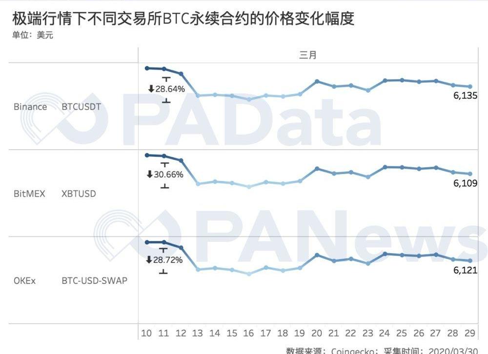 但从不同交易所的不同合约在极端行情下的价格跌幅来看,不同交易所中不同合约产品的深度又有所不同。从BTC永续合约来看,12日至13日,Binance的BTC永续合约跌了28.64%,OKEx跌了28.72%,BitMEX跌了30.66%。火币BTC永续合约由于推出较晚,暂未被Coingecko纳入统计。
