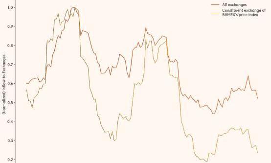 但并不能确定这一系列事件是否是同步发生的。例如,交易所流入量增加而BTC价格却没有同步随之增加。随着所有包含在BitMEX价格指数中的衍生品交易所数量增加,这种现象在未来应该不会再发生。