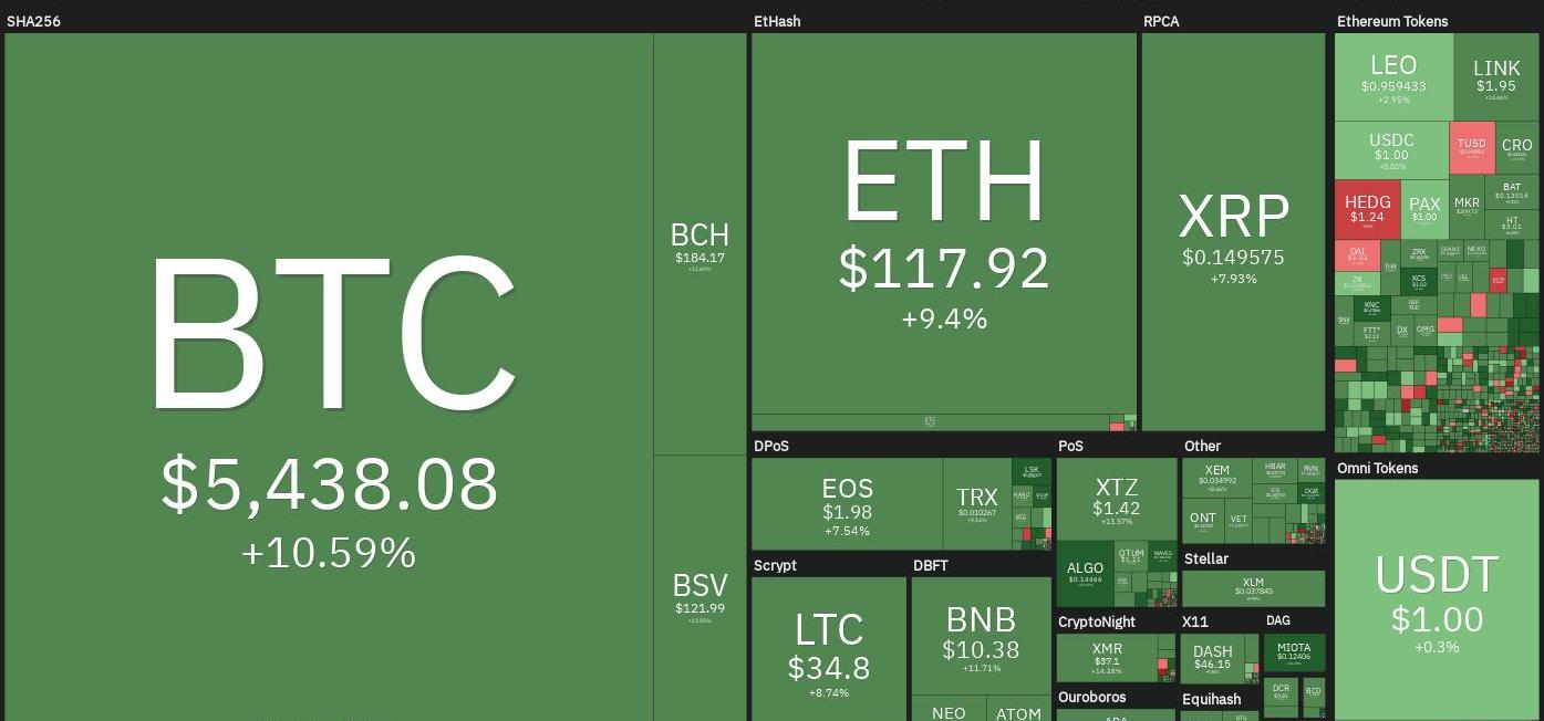 比特币市场周二继续从上周一度跌至3700美元的灾难性暴跌中复苏,该数字资产今日一度突破5500美元,随后回落至5400美元以下。加密市场走势的转暖似乎是从今天的白宫新闻发布会上获取的士气,美国财长姆努钦证实了有关特朗普政府将实施价值达1万亿美元的冠状病应对方案的报道。