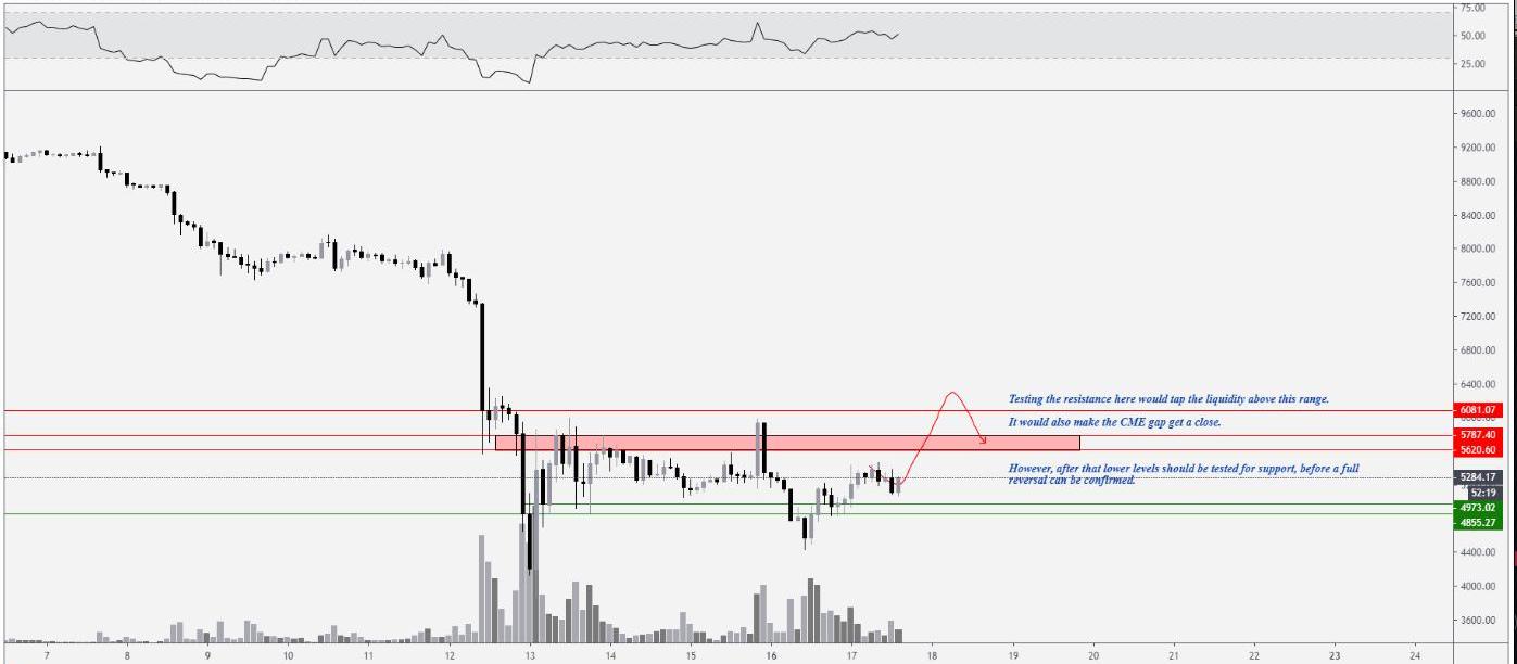 这将意味着,行情至少在上周的波动范围内盘整,从5200美元扩大到5600美元,并可能会进一步达到6000美元的位置。