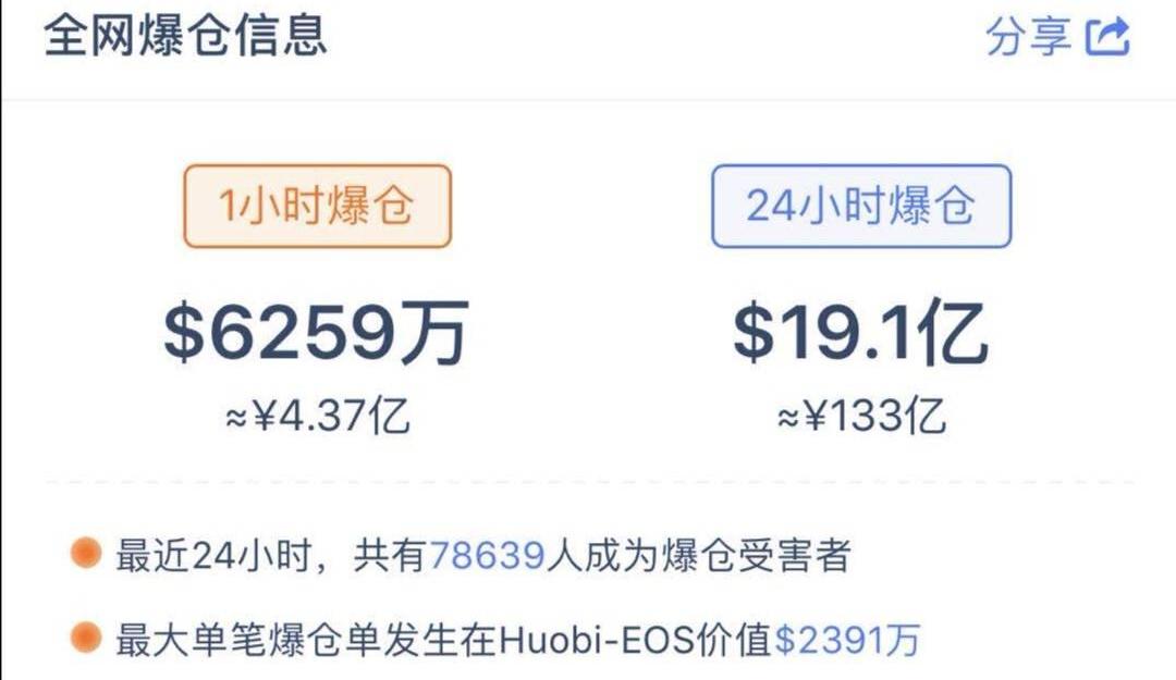 再论爆仓这件事,谁也不服,就服币圈。币coin数据显示,全网24小时有78639人成为受害者,总计爆仓19.1亿美元,折合人民币133亿。其中最大单笔爆仓发生在Huobi-EOS,价值2391万美元。数字货币市场特别容易发生踩踏事件,这一方面是由于它并没有传统证券熔断的机制,另一方面则是毫无节制的杠杆所致。