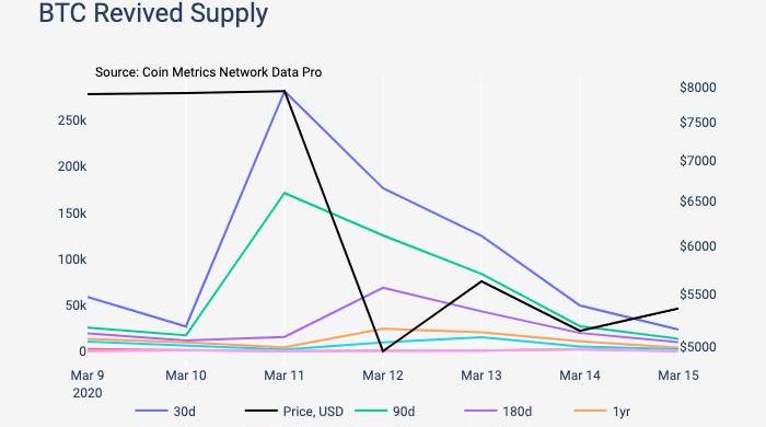 CoinMetrics对市场上发生转移的旧币进行了跟踪,在3月11日,全网大约有29.1万币龄30天以上的BTC发生了转移,而其中只有4,131BTC的币龄超过1年。这表明,3月11日和3月12日的绝大多数比特币交易活动,是来自持有时间不足1年的短线持有者。
