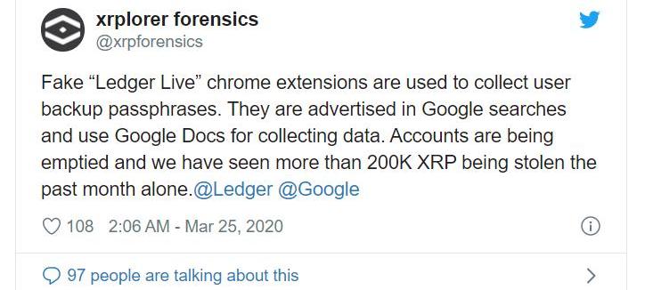 昨天,XRP跟踪浏览器xrplorerforensics在推特上发布了一条警告信息,其表示,在过去的一个月里,有超过20万XRP被盗。这是由于假冒的“LedgerLive”Chrome扩展程序,窃取了受害者的备份助记词,从而盗走了他们的加密货币。其警告称: