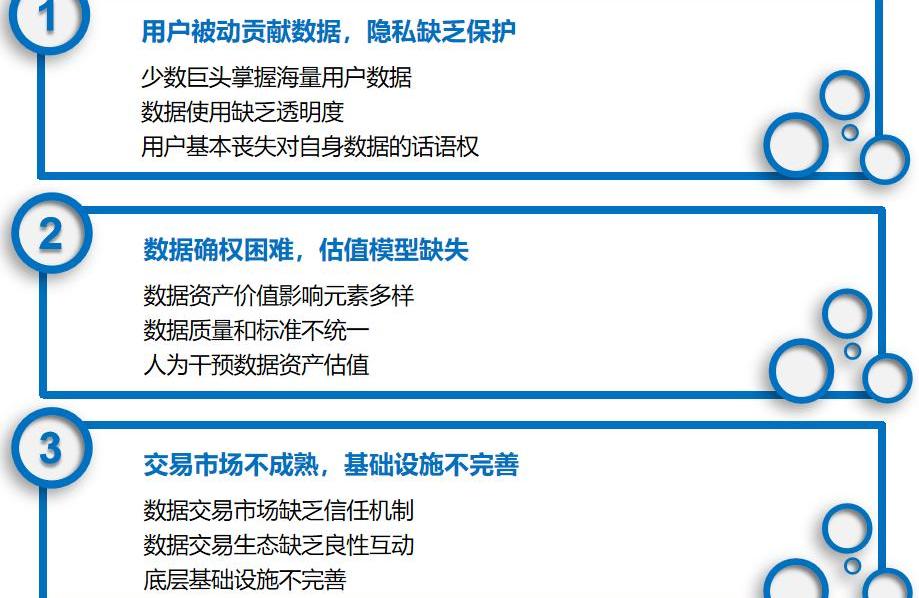 痛点三,数据交易市场不成熟,基础设施缺失。2014年以来,国内出现了一批数据交易平台,数据服务方式上有所丰富,却也存在着诸多问题:一方面市场缺乏信任机制,数据交易不规范且存在较大风险;另一方面也缺乏良性互动的数据交易生态,隐私、监管等问题日益突出。
