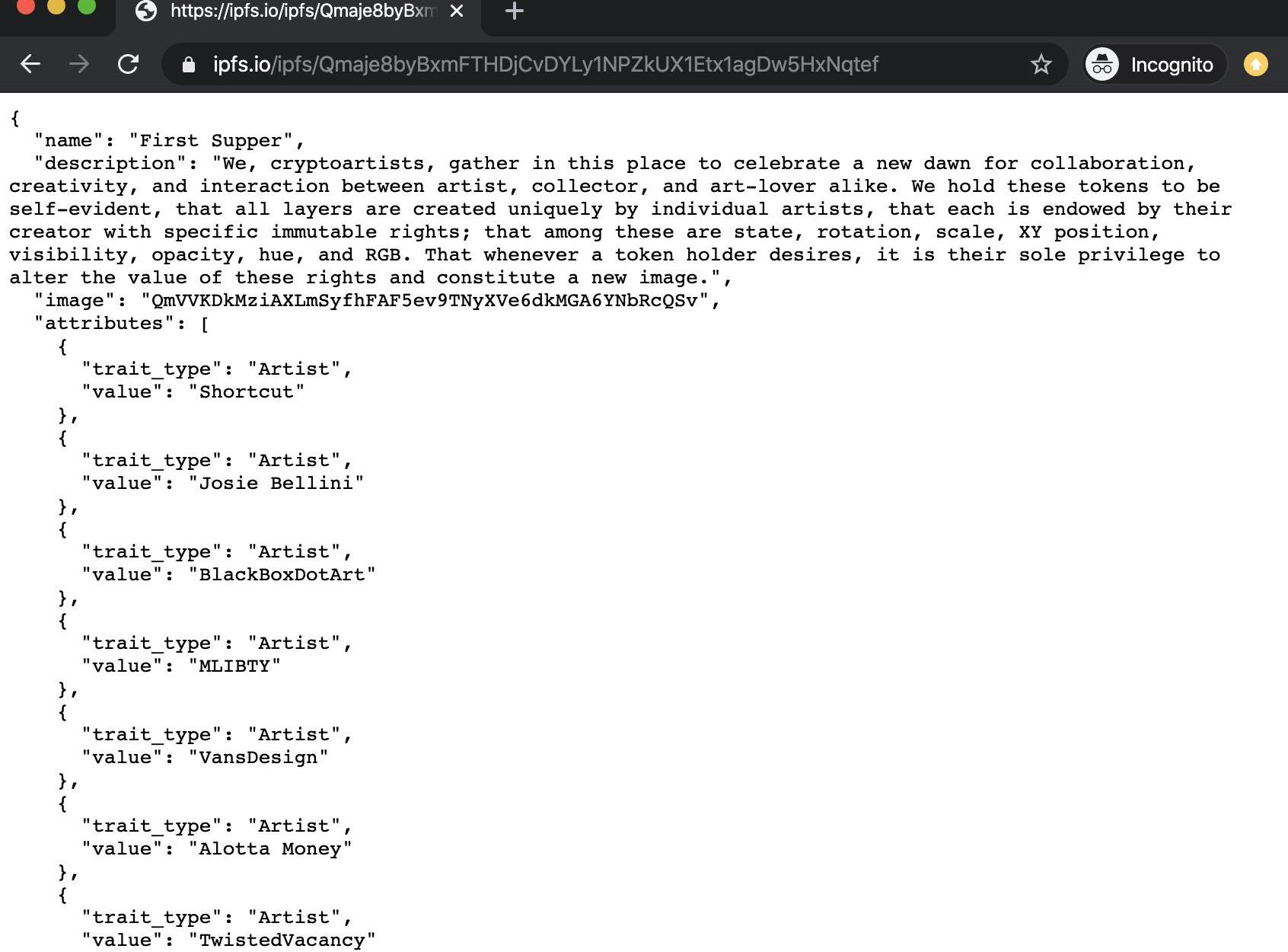 Master图片由Layer组成,一旦有任何的Layer进行更新,那么对应的Master都应该进行改变,其改变的方式是通过一个渲染器完成。渲染器在生成Master时需要知道两部分信息:一个是Layer的最新参数,这个只需要从合约中获得即可,智能合约中记录了每一个Layer当前的参数设定。另一个是Master的配置文件,即每一个Layer应该放在什么位置,不同Layer的参数应该如何渲染。,这个配置文件则存储在IPFS上。例如,FirstSupper的配置信息储存位置是: