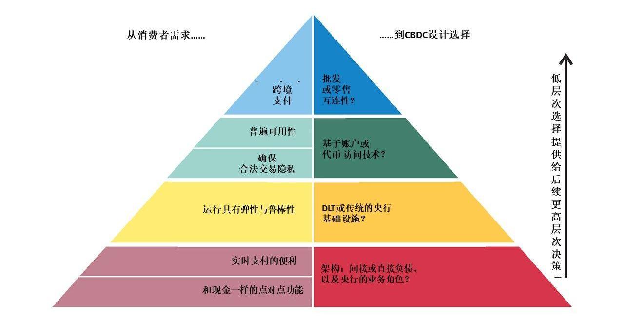 “我们用‘CBDC金字塔’图形来表示研究方法,它将消费者的需求反映在央行的相关设计选择上。该方案形成了一个层次结构,其中较低层的设计决策将作为后续更高级别决策的基础。”