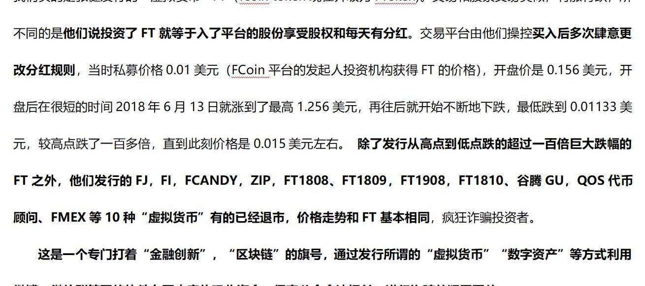 《报案材料》指出,2018年5月21日张健等人操控的“虚拟货币”交易平台FCoin.com在国家多次明令禁止的情况下上线运营,打着“区块链”“数字货币”的旗号发行其平台币FT用各种名目变相ICO。还接连发行了FJ,FI,FCANDY,ZIP,FT1808、FT1809,FT1908,FT1810、谷腾GU,QOS、FMEX、等10种“虚拟货币”主要销售给国内投资者,有的已经退市,操纵价格,疯狂投资者,让几十万国内投资者蒙受少说数十亿元损失,数额特别巨大。