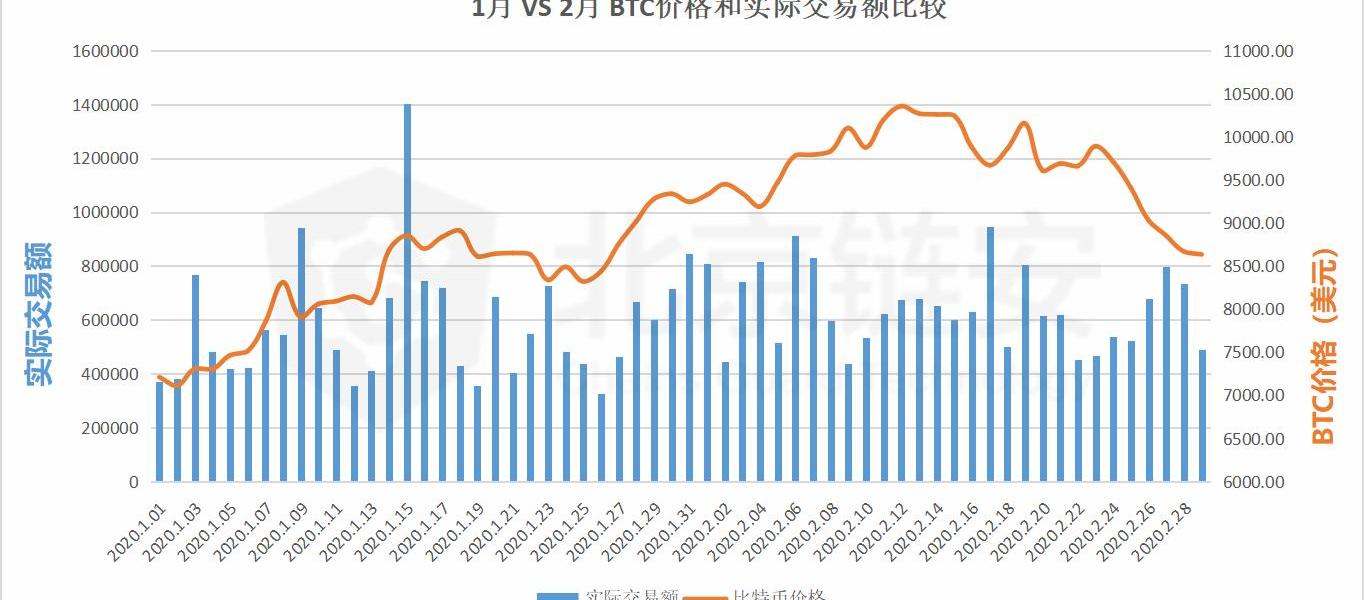 从近两个月比特币价格与交易额的对比来看,2020年2月上半月价格上升期间,链上交易额整体还是处于相对高位,但是在价格震荡阶段链上交易明显降低,接着便出现了价格的大幅下跌。