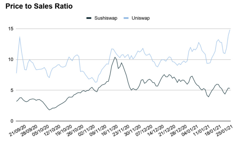 根据 Token Terminal 的数据,Sushiswap 一直保持稳定,P/S 比率约为 5,而 Uniswap 最近由于过去几周的价格大幅上涨而触及约 15。