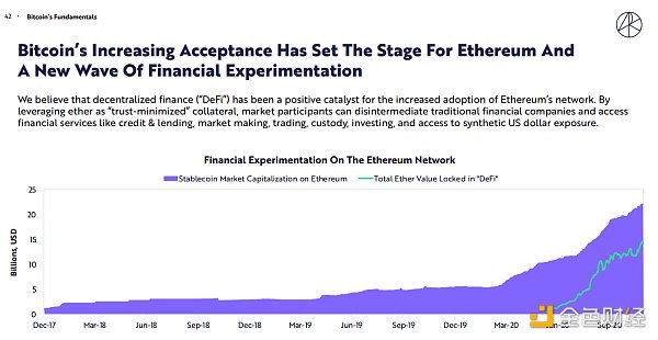 我们认为,DeFi对以太坊网络的采用提高起到了积极的促进作用。通过利用ETH作为 "信任最小化 "的抵押品,市场参与者可以解除传统金融公司的中间化,并获得金融服务,如信贷、做市、交易、托管、投资和获得合成美元头寸。