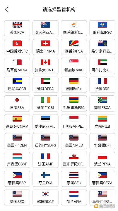 在监管查询功能中,区块天眼提供了包括FCA、ASIC、NFA在内的全球30多个国家地区监管机构的信息,在每个监管机构的页面中详细列出了已经有哪些交易所处在该机构监管之下,直接查询交易所或项目,也可直看到该平台和项目所取得的牌照信息。