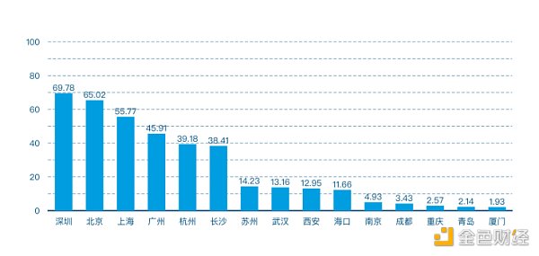 根据指数评价法按照本报告上述的指数核算方式得出2020年第四季度我国城市区块链综合指数TOP30城市排名,榜单前5名城市分别为北京(93.48)、上海(73.21)、深圳(72.22)、广州(61.99)、杭州(49.39)。第6名至第10名分别是长沙、苏州、海口、成都、重庆。值得注意的是,随着各地政府对区块链产业重视程度的增加,传统强市的排名有所增加。此外,北京虽然仍然保持绝对领先的优势,上海、深圳发挥各自的金融优势、科技优势在下半年区块链产业发展较为迅速,拉近了与北京的差距,广州超过了杭州排名第四,长沙持续在政策上发力保持了第六名,成都、海口发布了利好区块链相关政策冲进了前十。第11至第15名,分别是西安、南京、武汉、佛山、青岛。其中佛山、青岛在前期依靠政策优势取得的领先优势逐渐褪色,只有尽快将政策红利转化成产业红利,才能在未来的区块链产业中分一杯羹。总体来看,我国各城市区块链发展差距仍然较大,一线城市的优势依然明显。