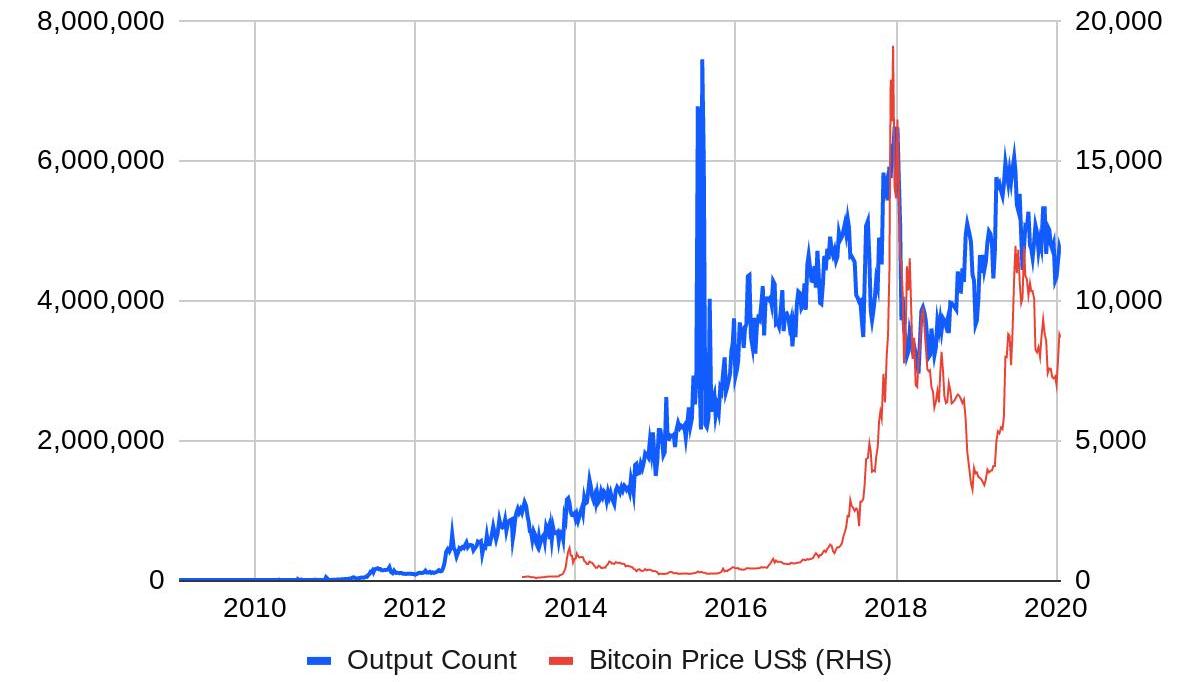 下图说明了比特币输出总数的增长以及其随着时间的推移如果发展。在比特币的历史中,已有近13亿个交易输出。当然,这些输出中只有一小部分仍未支出。目前,UTXO集超过65,00万,占累计总输出数量的5.1%。