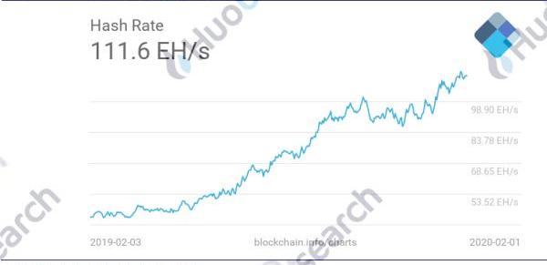 本周比特币算力上涨。2020年1月27日至2020年2月2日,比特币全网哈希值平均值为111.6EH/s,相比上周环比上涨0.90%。