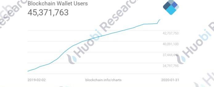 根据blockchain.info数据计算,截止2月2日,blockchain钱包用户总数达45491346个,与上周相比上涨0.44%。