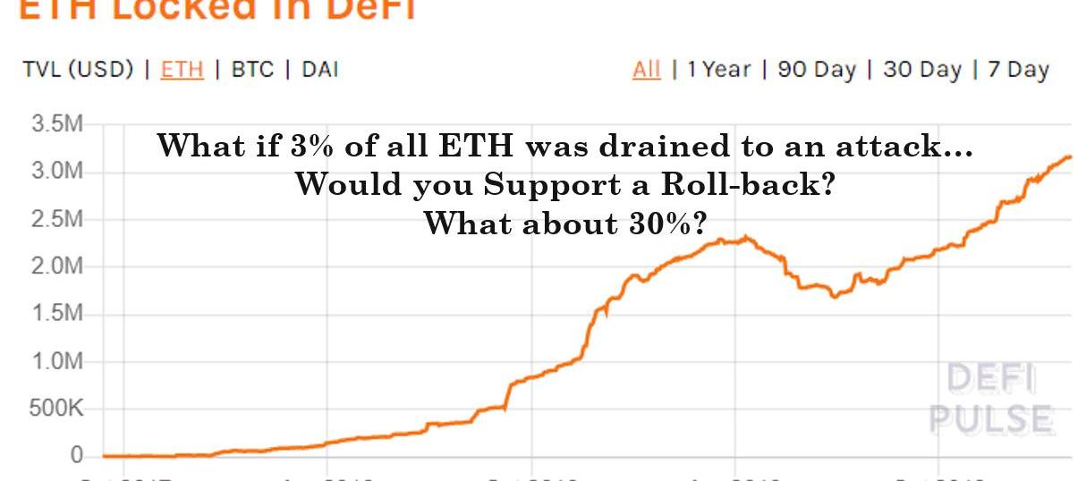 如果黑客从DeFi用户手上盗取了占总供应量3%的ETH,会不会再来一次回滚?3%不会,那30%呢?攻击者可是秒变PoS的最大验证者!