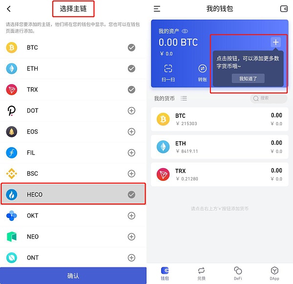 第四步:创建钱包或者导入钱包后,在选择主链界面,添加Heco,进入首页后,请在“我的资产”界面点击”+“这个符号。