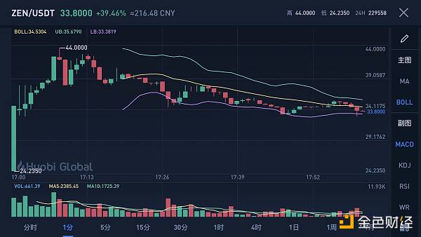 金色财经讯,1月25日17时,火币全球站开放ZEN?(Horizen) 的USDT交易对 (ZEN/USDT),开盘价格24.235USDT,数分钟后即上涨至44USDT,涨幅达81.56%。截至发稿时价格有所回落,现为33.8USDT。