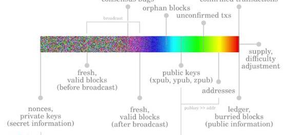 了解了比特币的发展阶段、秩序、信息、随机性和熵等概念,让我们来看看比特币的一些概念。从视觉上区分:从混沌到有序。