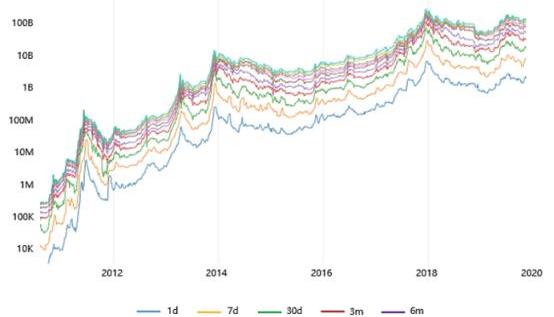 我们将币天销毁数据转化为不同期限持有的资产,转化结果如下图所示。可以更直接地反映出,每一轮币价增长,囤币数量也在增长。其中,1d数据可以近似看成每日链上交易量。