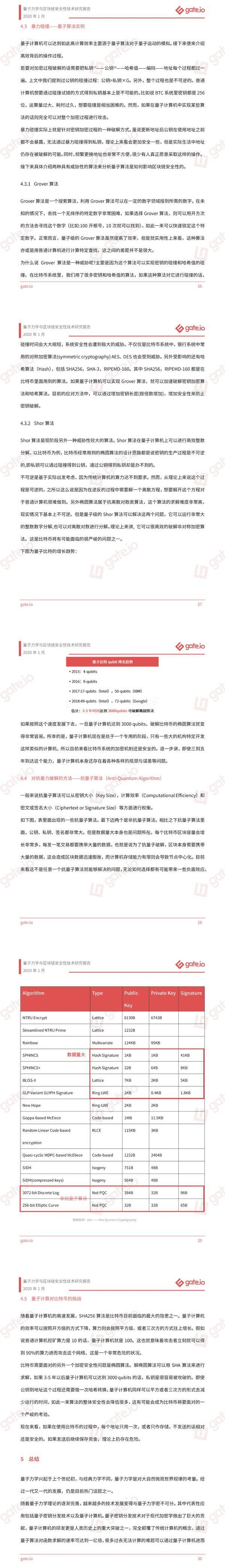 -量子计算机与量子算法的面世对区块链加密机制造成了严重的威胁,哈希算法以及密钥加密算法存在被破解的可能。其中“Grover算法”以及“Shor算法”更是对攻破椭圆曲线算法、SHA256算法有着极高的效率。