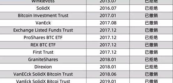 一、未能逃脱魔咒的比特币ETF2018年底的预测中,言之凿凿“2019年将是比特币ETF通过之年”。但随着1月初提交的ETF申请一份自主撤销,一份被SEC拒绝,2019年最受看好的冲刺均告折戟。