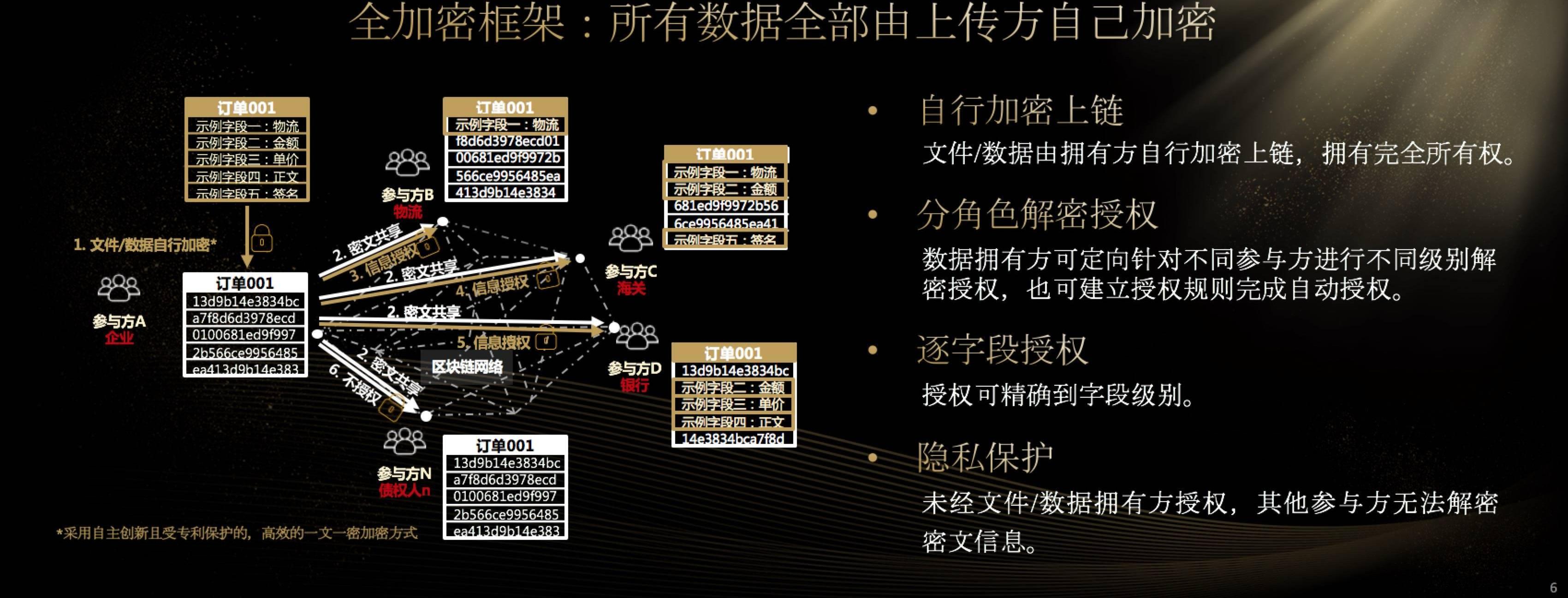 平安的全加密框架,所有的数据都采用字段加密。比如一个订单通常有100-200个字段。每一个字段都用独立的密钥进行加密。我们通过密码学控制参与方B只能看到物流数据,参与方C看到物流,金额和报关签名,参与方D看到金额、单价和正文。银行和海关能看到的金额数据是一样的,这个企业要融资,就要做选择,因为打家看到的都是一份数据。我们在这里可以通过密码学的控制决定谁能看到什么数据、谁能改什么数据、谁能操作什么数据。前面几位演讲嘉宾都说了数据的重要性,这也是平安壹账通最看重的,我们要从根本上解决所有数据的隐私的问题才能让数据的价值得到体现。