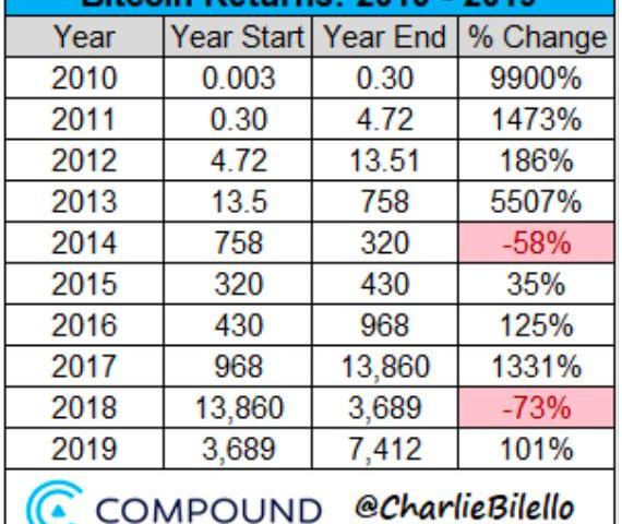 CompoundCapitalAdvisors创始人CharlieBilello贴出了2010年-2019年比特币年初-年末价格相比的回报率: