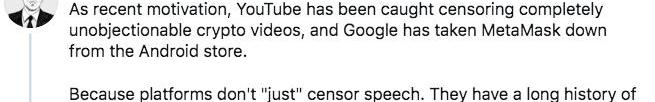 最近的动力源是YouTube审查完全无异议的加密视频,Google将MetaMask从安卓商店中撤下。因为平台不“仅仅”审查言论。他们有审查竞争技术的悠久历史。