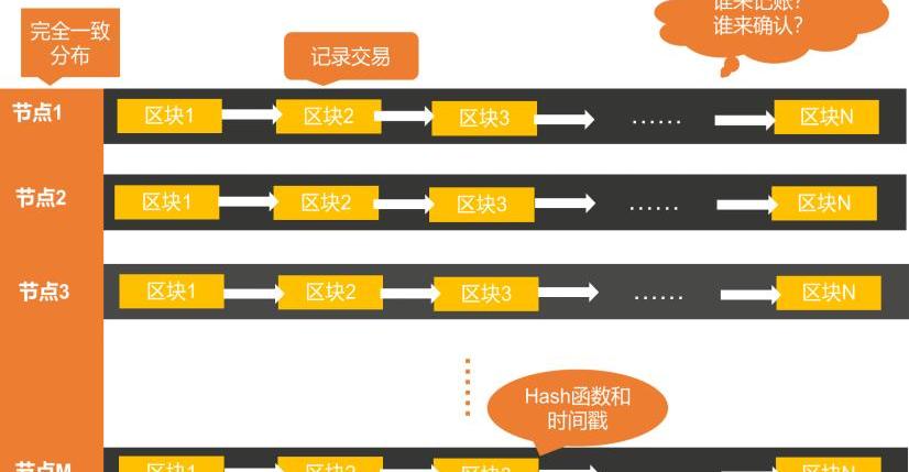 如上图所示,比特币系统中每一个节点都是一台单独的计算机,每一个区块是对应计算机上的一个存储空间,每个区块上记录的是一段时间内的比特币交易记录。区块与区块之间通过时间戳和一个被称为“哈希函数”的单向函数保证相关节点上存储的记录数据不可被篡改。比特币系统将交易记录数据通过点到点网络,也就是P2P对等网分发存储在全网所有节点上,通过这种数据的高度冗余,从另一个层面保证了数据的全网一致性。