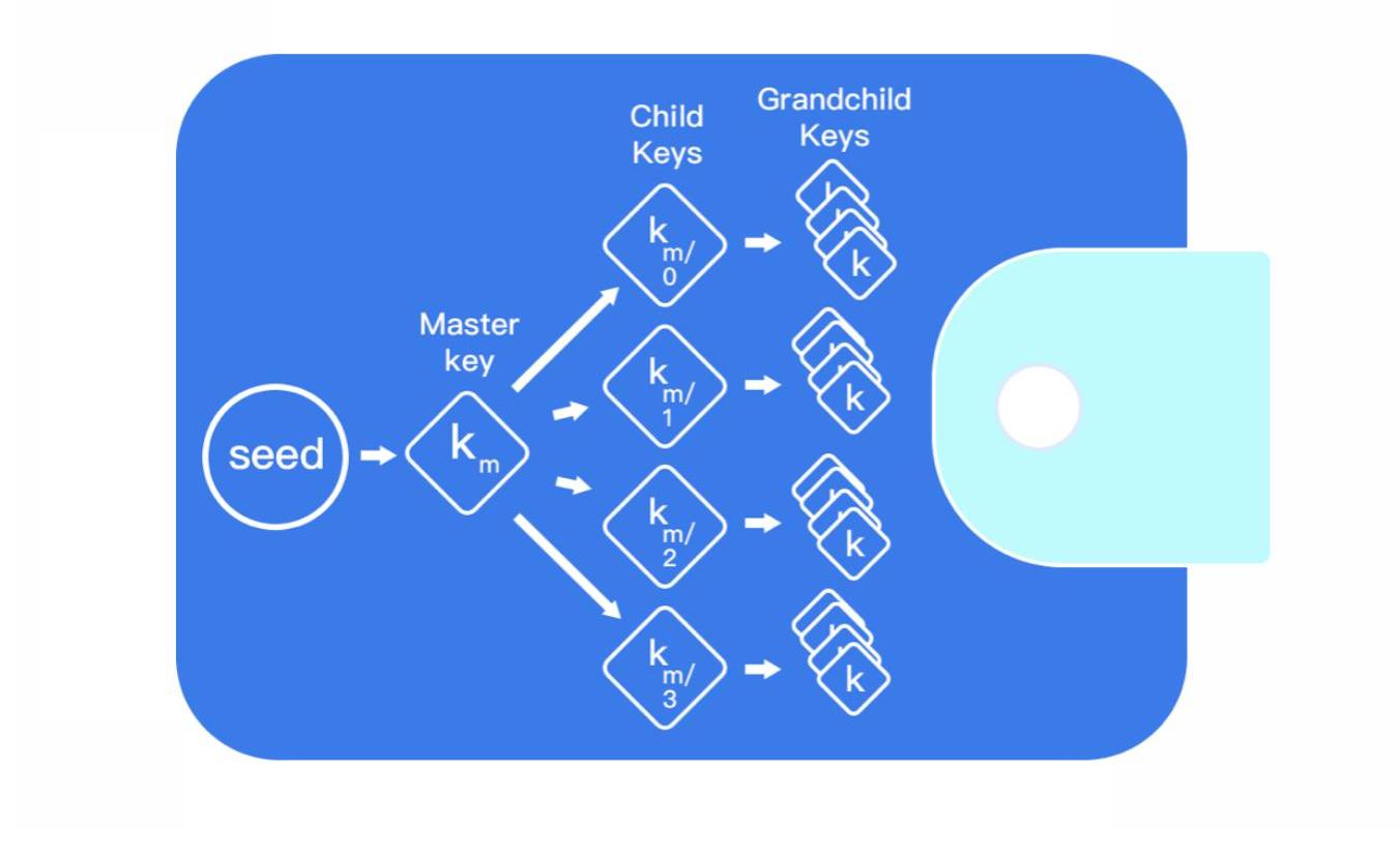 是确定性钱包的加强版,为确定性钱包引入「主私钥」概念,即HD钱包。它的层级结构是,从主私钥生成的私钥,本身就可以成为一把主私钥,再通过上述方法生成一个确定性钱包。