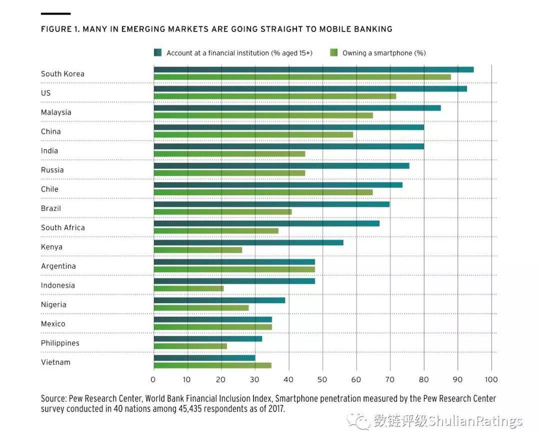 图表显示许多新兴市场国家直接涌入手机银行。皮尤研究中心2017年在40个国家对45435名受访者进行的调查显示,中国的智能手机普及率达到了40%。
