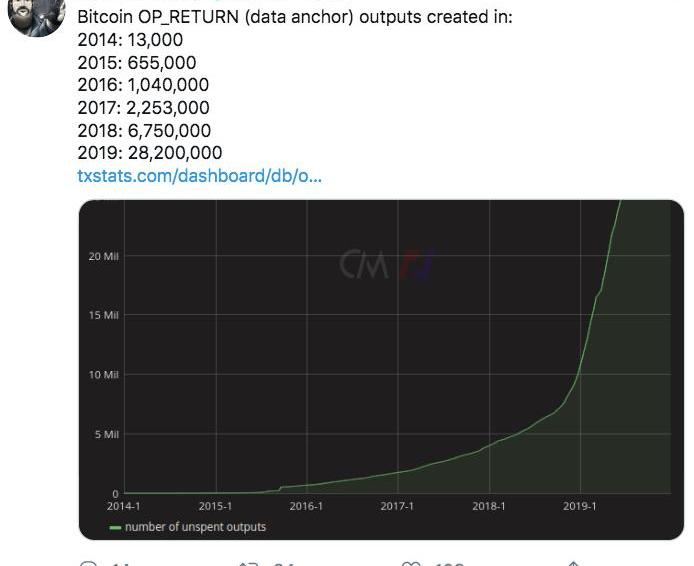2014年-2019年被创建的比特币OP_RETURN输出:
