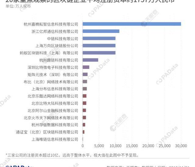 这20家企业的平均注册资本大约为1757万人民币,而根据PAData早前统计,经营业务涵盖“区块链”的公司中,50%的注资都在百万人民币级别。这些市场声量较高的企业在资本规模上大于一般相关企业。