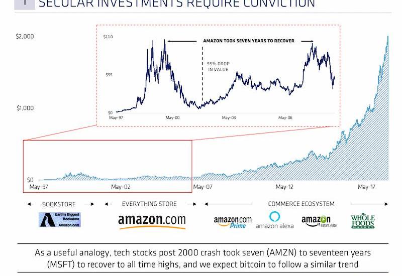 2000年科技股崩盘之后用了7(AMZN)–17年的时间才恢复到历史高点,我们预计比特币也会出现类似的趋势。