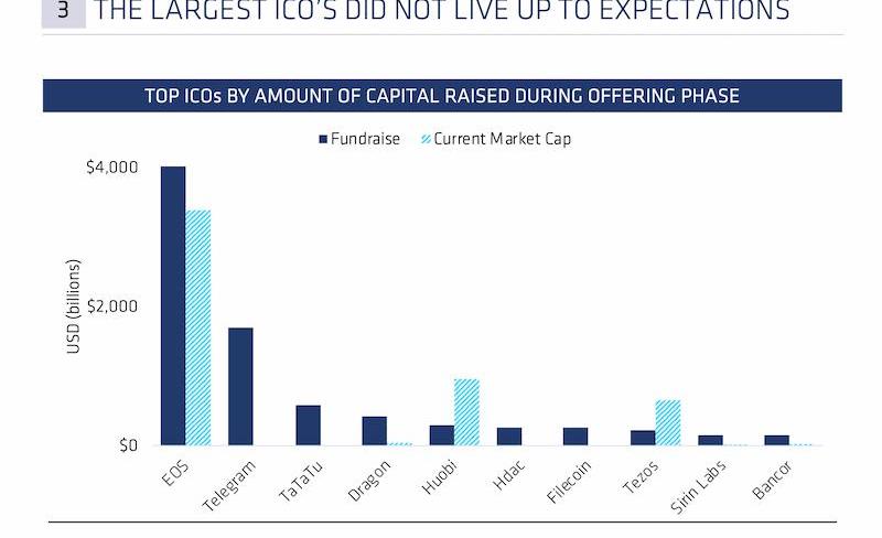 这是史上募资最大的10个项目的募资额和现有市值对比,其中只有Huobi和Tezos没有破发,超过一半的项目还没有上线或者市值暴跌。