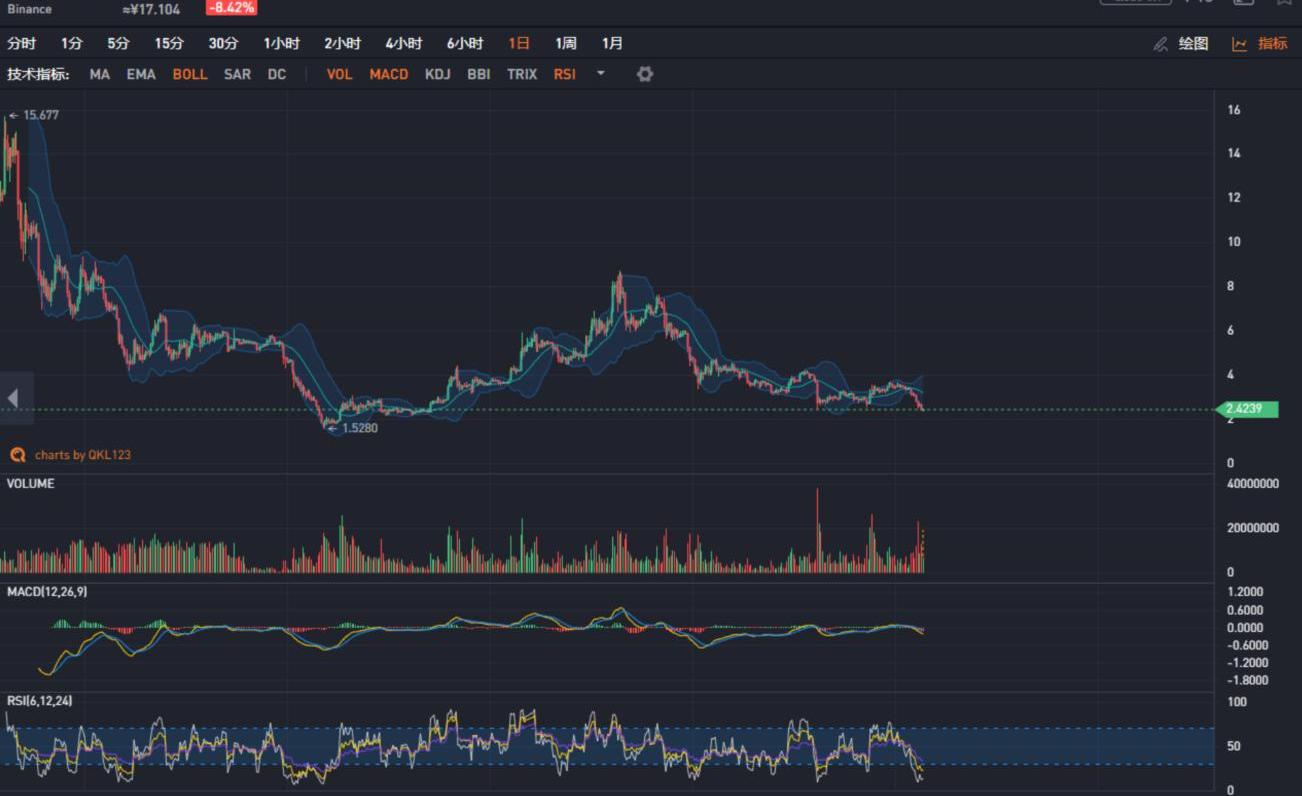 ETH跌幅较大,已跌破近期低点附近,目前来到135美元的支撑位附近,短时超跌反弹的可能性较大。