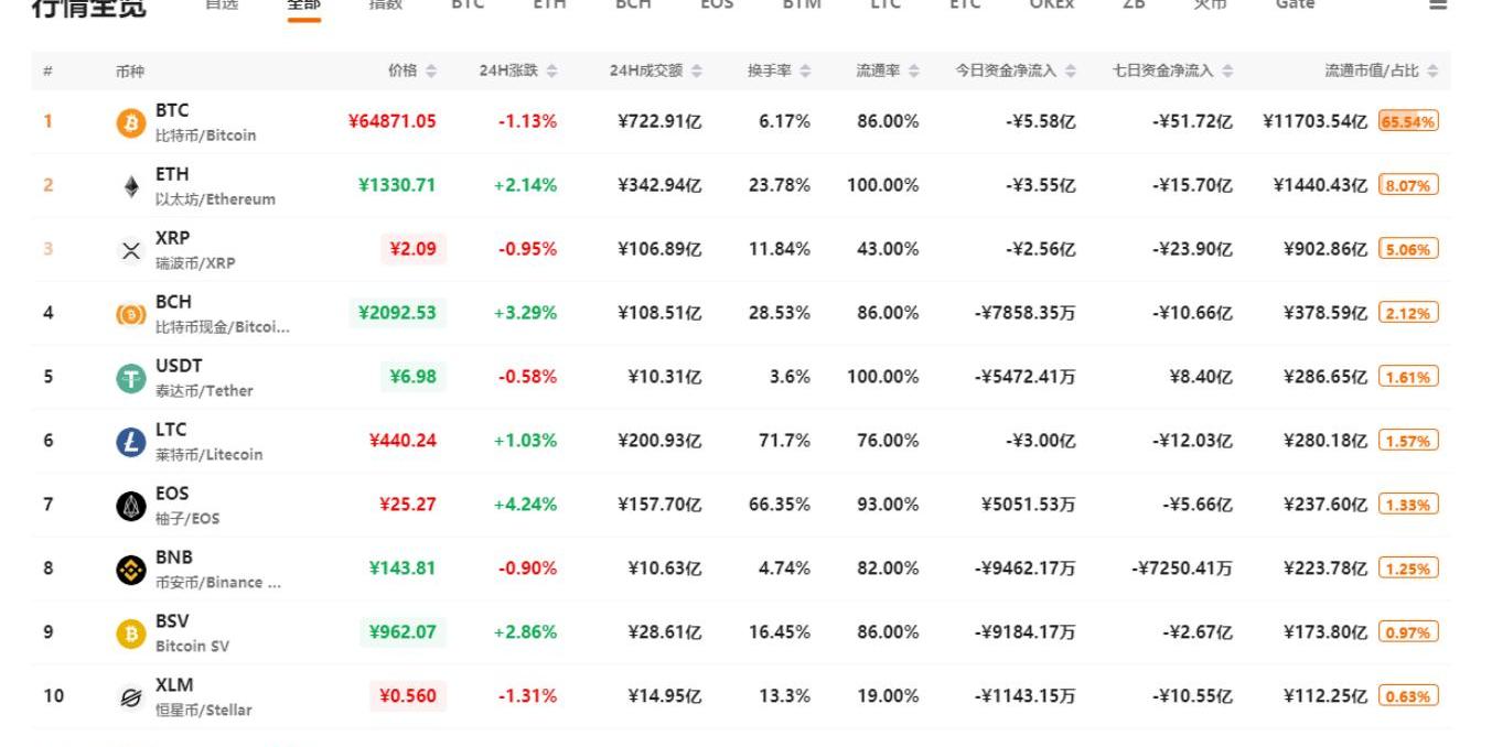 据QKL123数据统计,2019年11月06日13时,全球Token市场的总市值为17849.37亿元,24小时总市值增减-0.01%,总成交额为6270.57亿元,总成交额变化-2.14%,市场活跃度略有下降。巴比特综合指数报13083.59点,24小时涨跌为+0.51%,反映大盘略有回升;比特币强弱指数报93.68点,24小时涨跌-3.09%,比特币在整个市场的相对表现明显变弱;Alternative情绪指数为53,较昨日略有减少,市场情绪表现为中性。