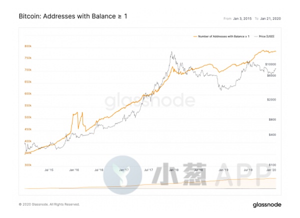 多年来,尽管比特币价格较为波动,但拥有一个或多个比特币的账户地址数量一直保持稳定增长。