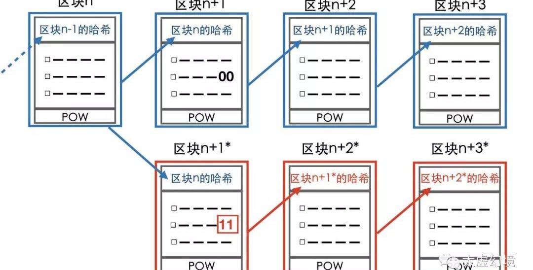 第一,改变任意一个区块的信息,都会导致这个区块的哈希值变化,同样也会改变下一个区块的信息,接着之后所有的区块都会改变,整条区块链都会变的无效,得重新再算一遍,找到对应的POW才行。这一点保证了整个账本的严密准确性。