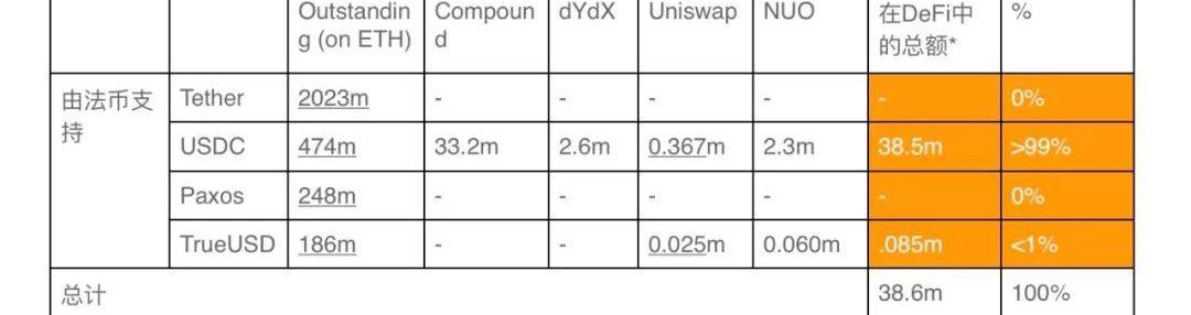 截至2019年10月21日,在主要DeFi项目中,由法币支持的几个主要稳定币的总余额