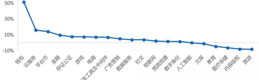 行业公链及应用中,按照行业进一步细分,大部分领域上涨,其中钱包领域涨幅最大,达到51.33%。