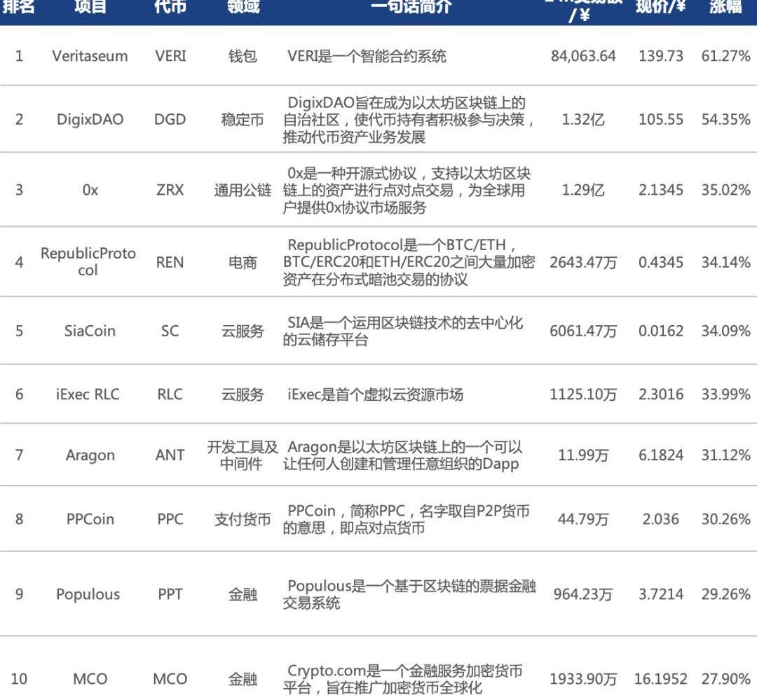 从个币涨幅来看,上周市值TOP200的资产中,VERI较上一周涨幅最高,达到61.27%。
