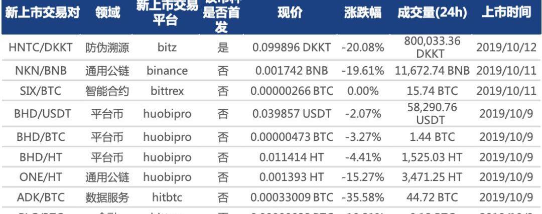 OKEx、Binance、HuobiGlobal、Bitfinex、Bithumb、ZB.com、Upbit、HitBTC、Bittrex、Poloniex等30?家交易平台,新上市交易对9个。