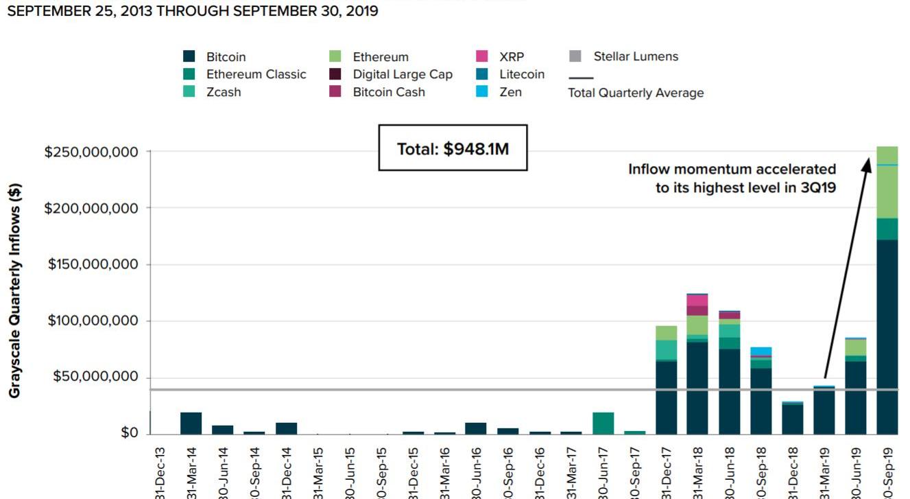 根据以上图表,2019年第三季度资金流入量占灰度产品自创建以来总累积流入量的近27%。Grayscale在过去三个月中筹集了2.549亿美元,平均每周投资额为1,960万美元。
