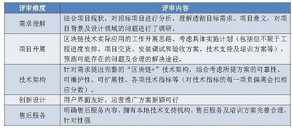 商务评审主要针对团队资质、业绩、荣誉三方面。团队资质和业绩是每个招标项目均有涉及的方面,即根据投标单位所派遣团队的基本情况和成功案例对该单位进行非技术层面的评估,通常要求人员配置合理且具有相关证书(高级信息系统项目管理师)等,且近三年签订了区块链相关的战略协议或有区块链相关项目通过验收。荣誉部分有时也会纳入考量范围,广州中国科学院计算机网络信息中心的区块链基础架构模型研究服务采购项目竞争性磋商文件明确表示:投标人在区块链行业内的具有行业特殊的经验、成就或近三年内获得区块链相关奖项、荣誉证书可最高加11分(行业特殊经验是指:例如参与近两年中国区块链白皮书的制定、加入区块链产业联盟、在行业内有建设性成就的经验等)。