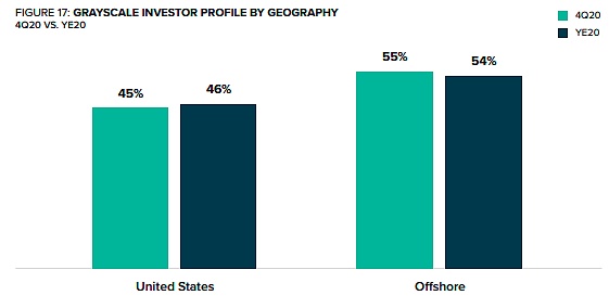 本季度新增灰度产品投资资本的地理来源中,海外投资者的权重略高(55%),与2020年持平。