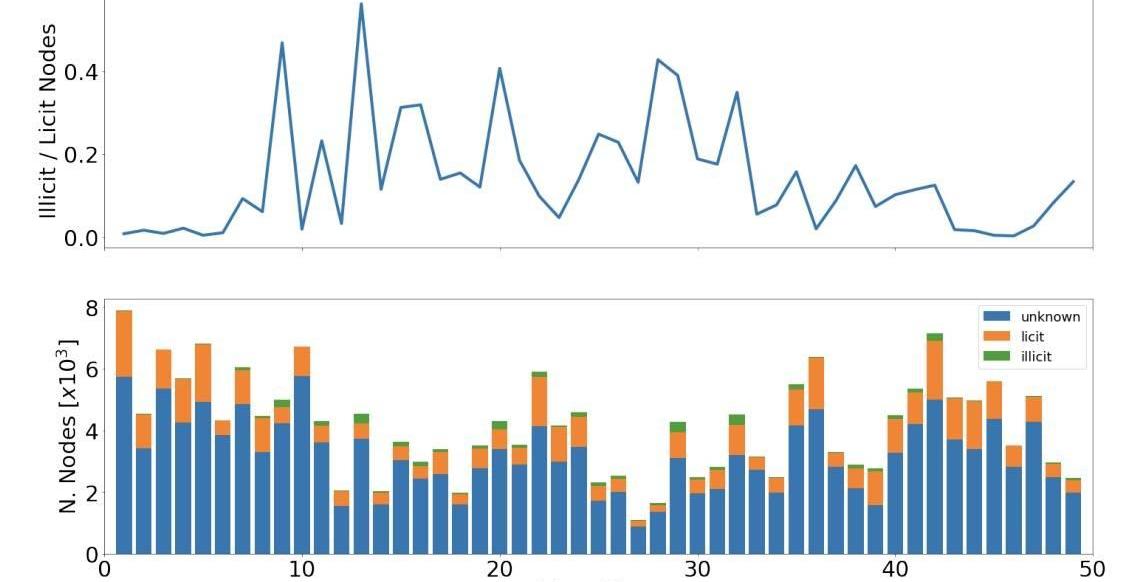 图1:数据集中不同时间步长,非法节点与合法节点的比例。节点数与时间步长
