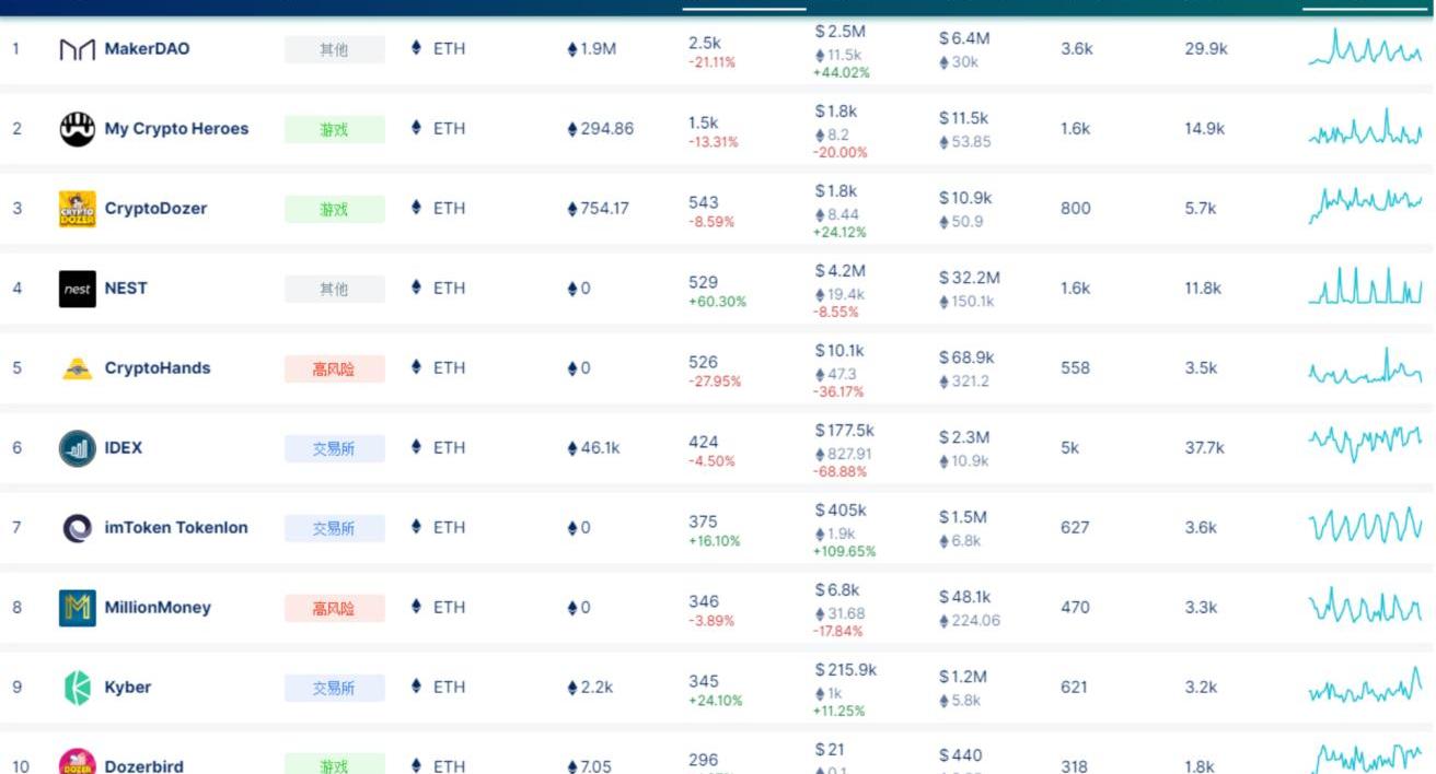 观察DappRadar统计数据,24小时ETHDApp整体活跃程度继续降低,新增2个DApp。其中,金融应用MakerDAO的24小时活跃用户数2.5k,24小时变化-21.11%;游戏应用MyCryptoHeroes的24小时活跃用户数1.5k,24小时变化-13.31%;交易应用IDEX的24小时活跃用户数424,24小时变化-4.50%。